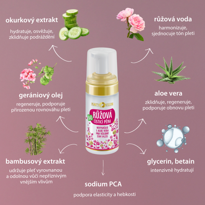 Ružová čistiaca pena hĺbkovo odstraňuje nečistoty a prebytočný maz, bez toho aby narúšala prirodzenú rovnováhu pleti. Vďaka kombinácii betainu, sodium PCA a aloe vera pleť upokojuje a pomáha jej udržať prirodzený komfort bez pocitu pnutia. Esenciálny olej z geránia podporuje regeneráciu a zanecháva pleť hebkú, vyváženú a prirodzene žiarivú. Uhorkový extrakt dodáva sviežosť a ľahkosť, čo z tejto peny robí ideálnu voľbu pre suchú, citlivú a unavenú pleť, ktorá túži po jemnom a účinnom čistení.
